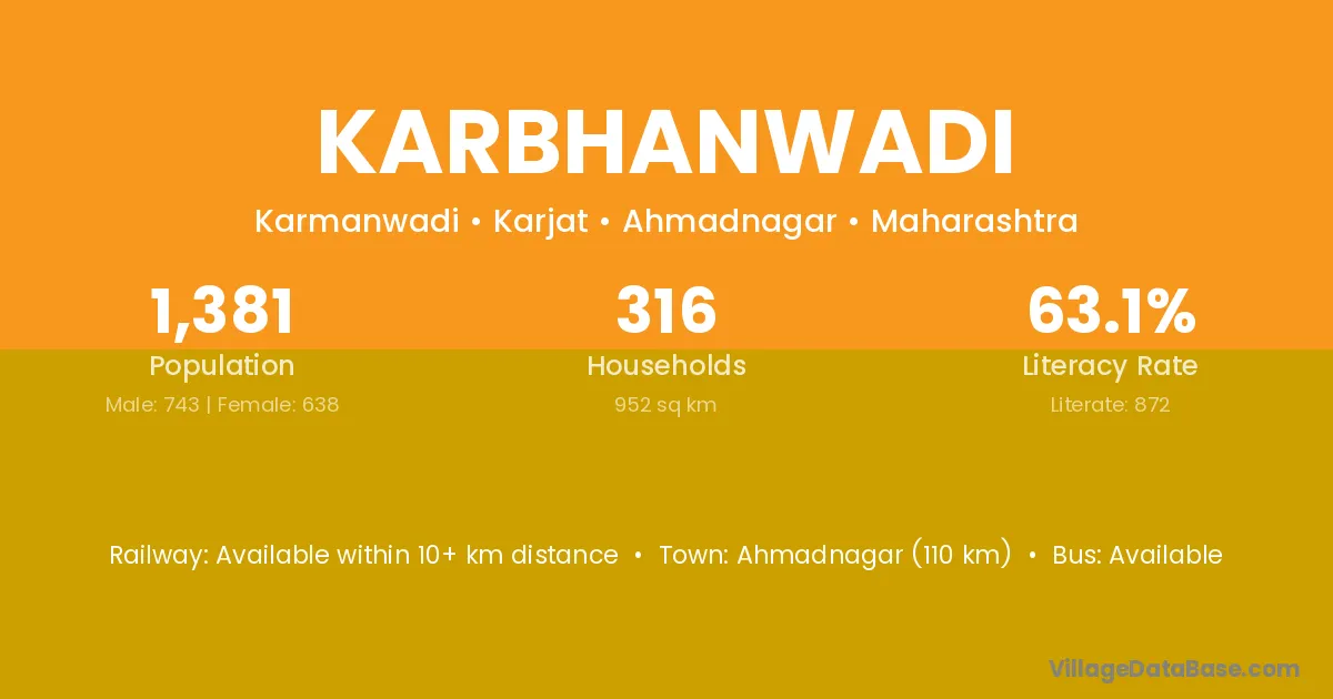 Ahmadnagar (110 km) is the nearest town to Karbhanwadi village for major economic activities and is located approximately 110 km away.