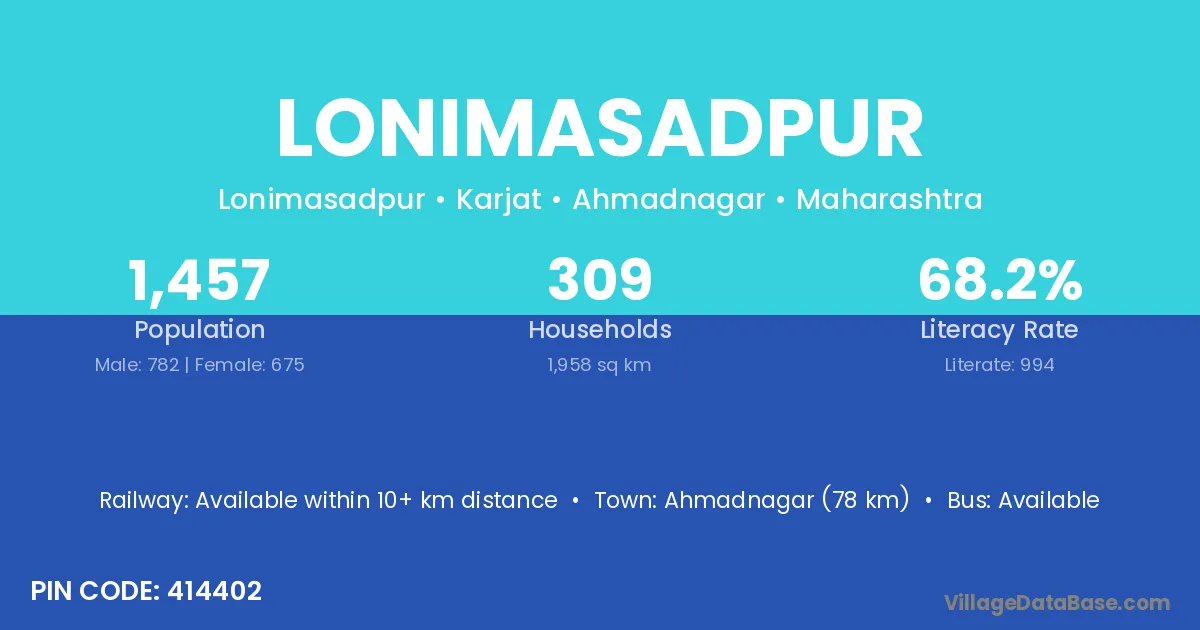 Ahmadnagar (78 km) is the nearest town to Lonimasadpur village for major economic activities and is located approximately 78 km away.