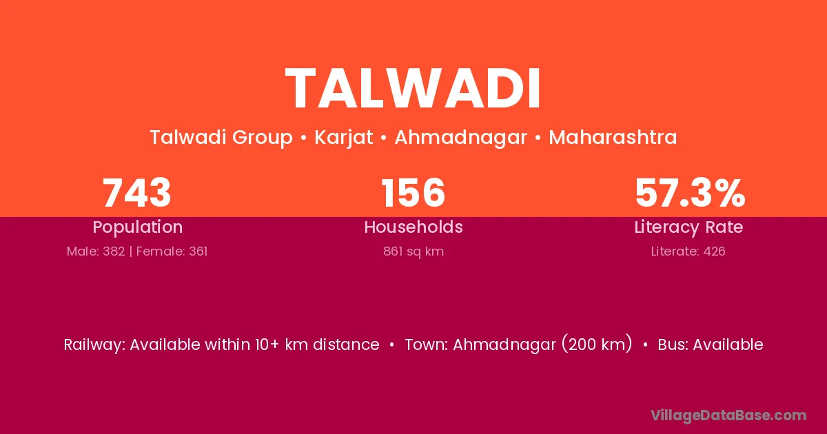 Ahmadnagar (200 km) is the nearest town to Talwadi village for major economic activities and is located approximately 200 km away.