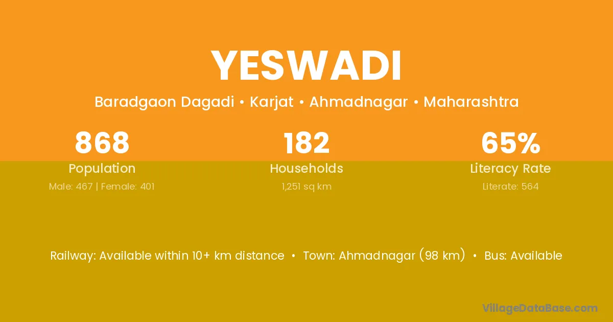 Ahmadnagar (98 km) is the nearest town to Yeswadi village for major economic activities and is located approximately 98 km away.
