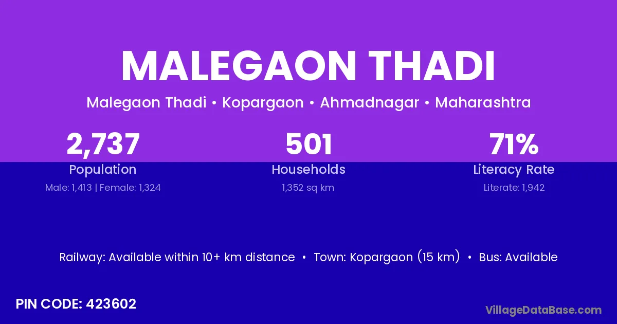 Kopargaon (15 km) is the nearest town to Malegaon Thadi village for major economic activities and is located approximately 15 km away.