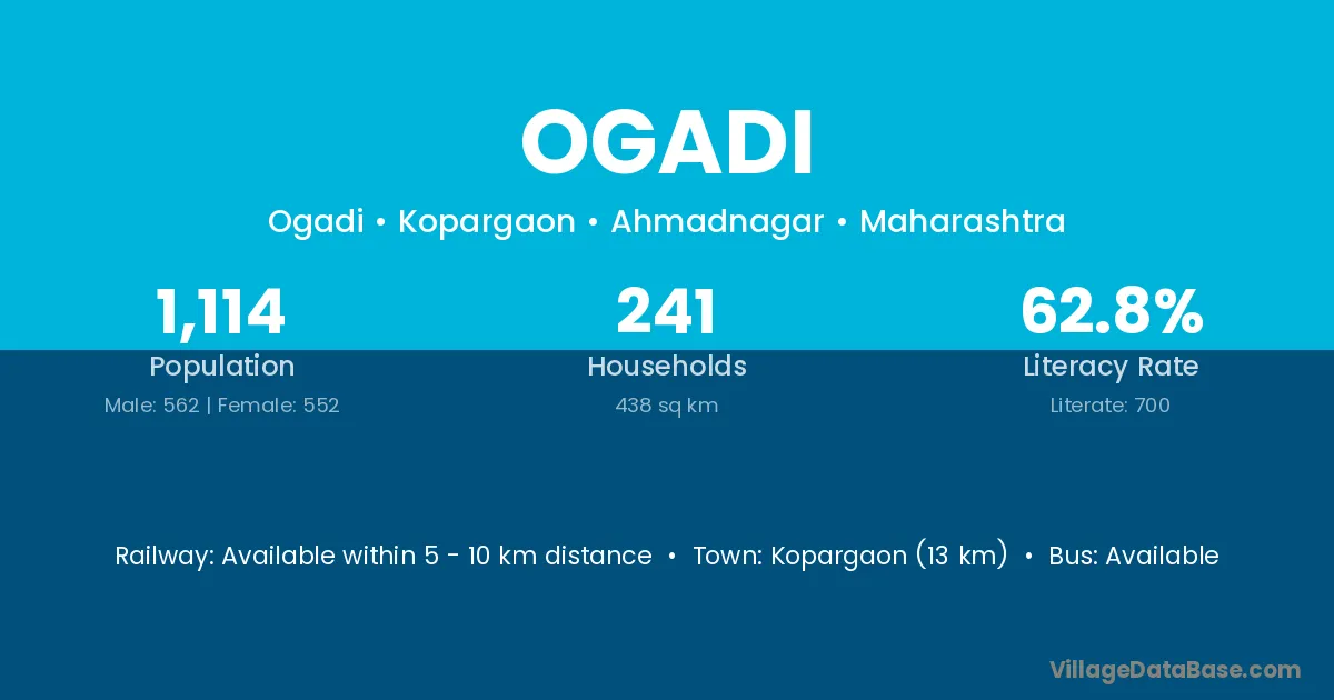 Kopargaon (13 km) is the nearest town to Ogadi village for major economic activities and is located approximately 13 km away.