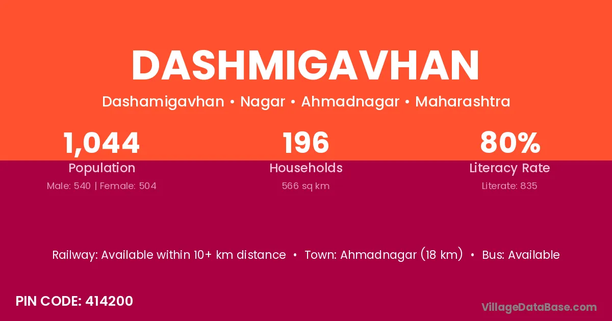Ahmadnagar (18 km) is the nearest town to Dashmigavhan village for major economic activities and is located approximately 18 km away.
