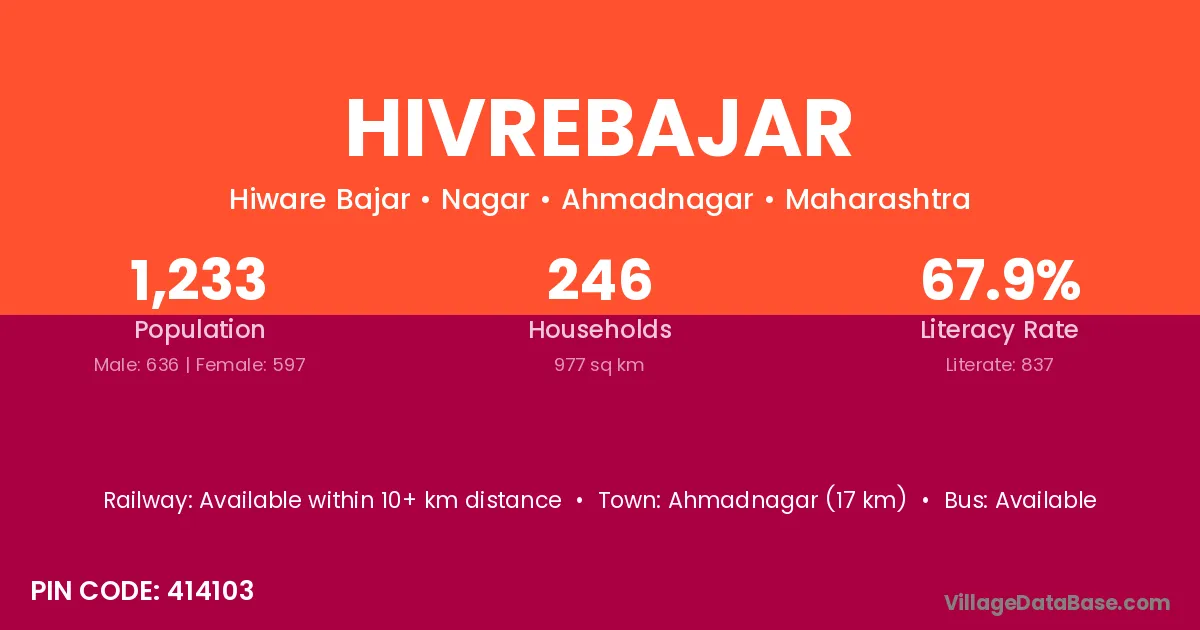 Ahmadnagar (17 km) is the nearest town to Hivrebajar village for major economic activities and is located approximately 17 km away.