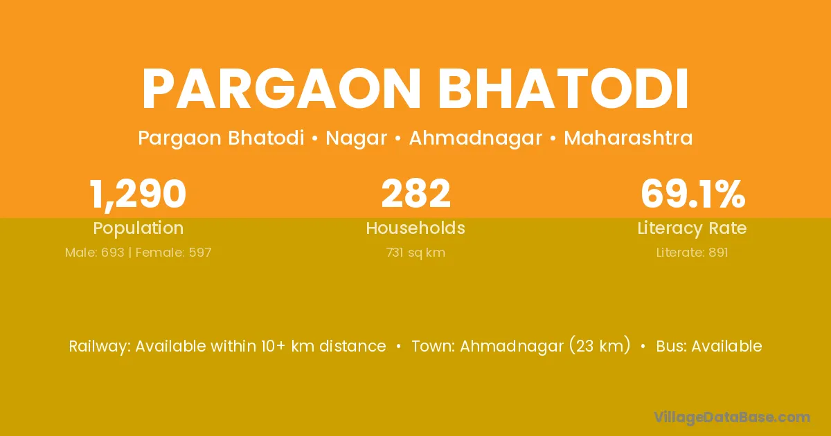 Ahmadnagar (23 km) is the nearest town to Pargaon Bhatodi village for major economic activities and is located approximately 23 km away.