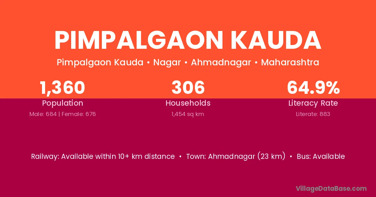 Pimpalgaon Kauda village has a total population of 1,360 people, of which 684 are males and 676 are females.