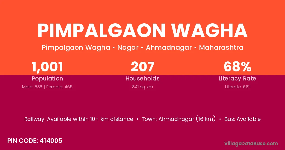Pimpalgaon Wagha village has a total population of 1,001 people, of which 536 are males and 465 are females.