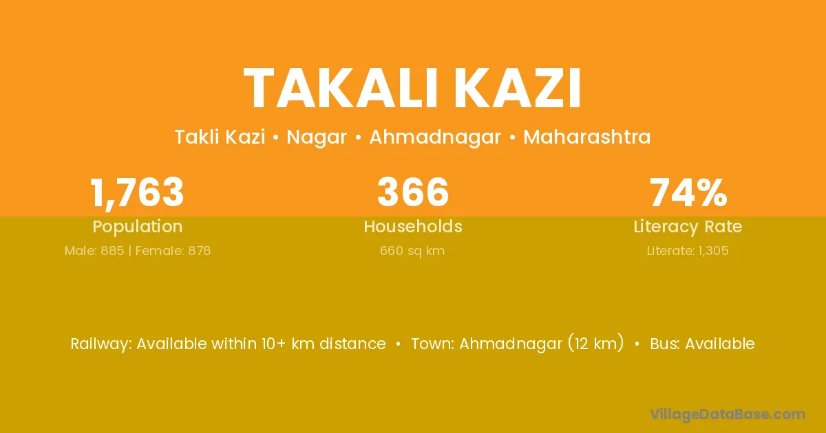 Ahmadnagar (12 km) is the nearest town to Takali Kazi village for major economic activities and is located approximately 12 km away.