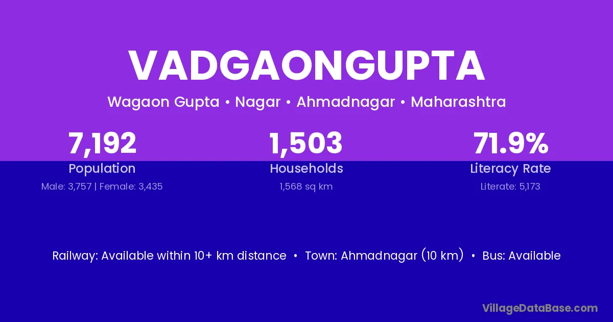 Ahmadnagar (10 km) is the nearest town to Vadgaongupta village for major economic activities and is located approximately 10 km away.