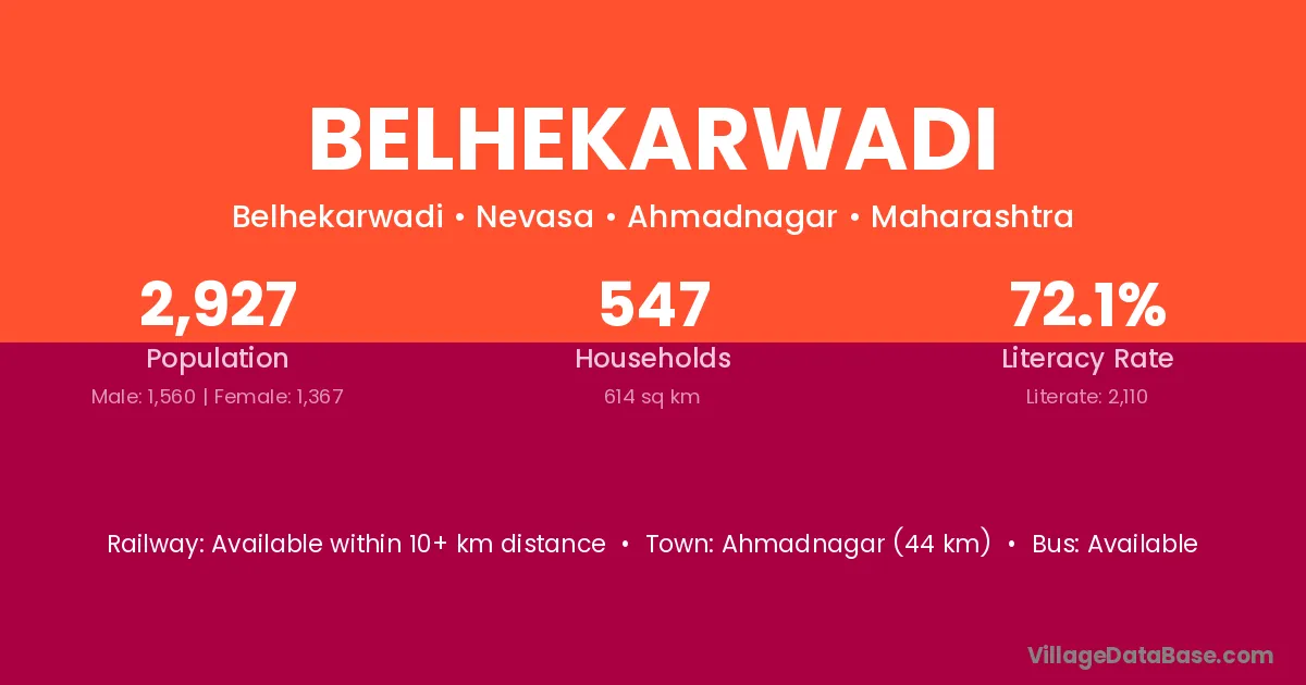 Ahmadnagar (44 km) is the nearest town to Belhekarwadi village for major economic activities and is located approximately 44 km away.