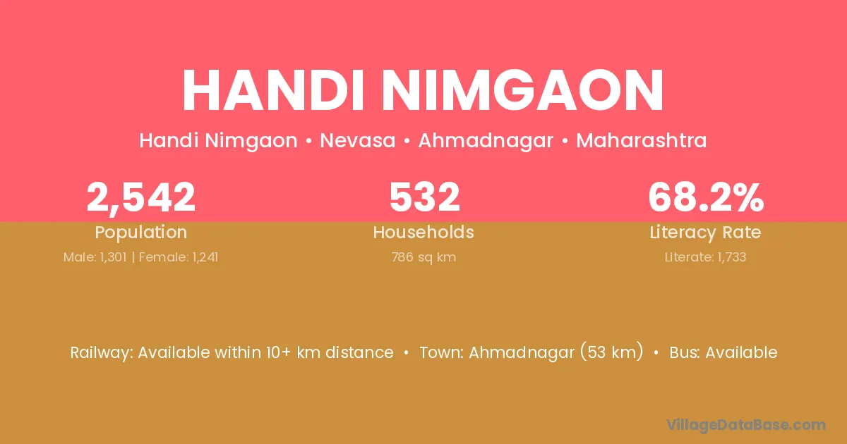 Ahmadnagar (53 km) is the nearest town to Handi Nimgaon village for major economic activities and is located approximately 53 km away.