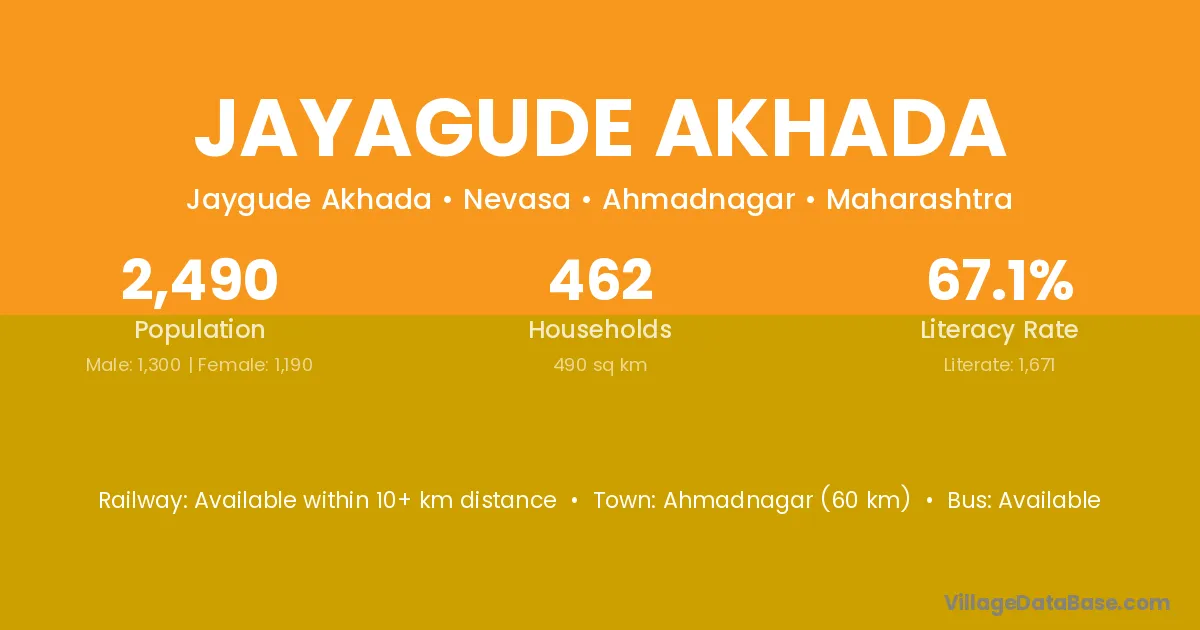 Ahmadnagar (60 km) is the nearest town to Jayagude Akhada village for major economic activities and is located approximately 60 km away.