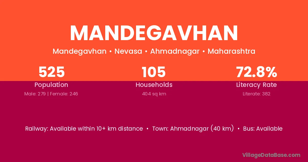 Ahmadnagar (40 km) is the nearest town to Mandegavhan village for major economic activities and is located approximately 40 km away.