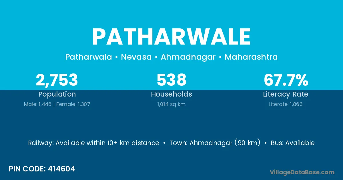 Ahmadnagar (90 km) is the nearest town to Patharwale village for major economic activities and is located approximately 90 km away.