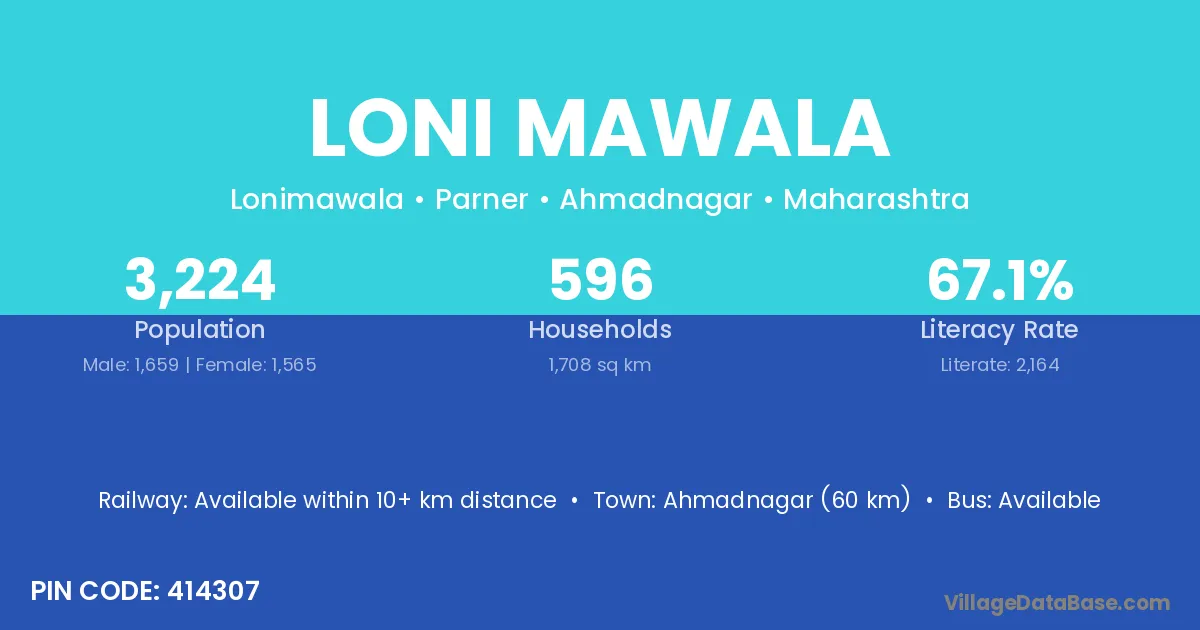 Ahmadnagar (60 km) is the nearest town to Loni Mawala village for major economic activities and is located approximately 60 km away.
