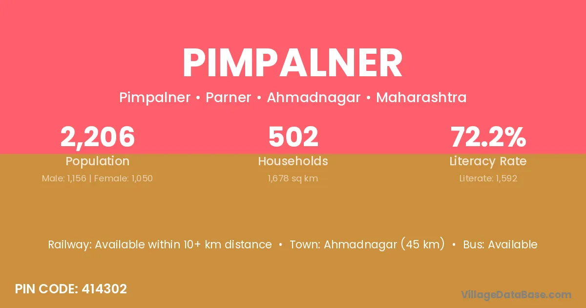 Ahmadnagar (45 km) is the nearest town to Pimpalner village for major economic activities and is located approximately 45 km away.