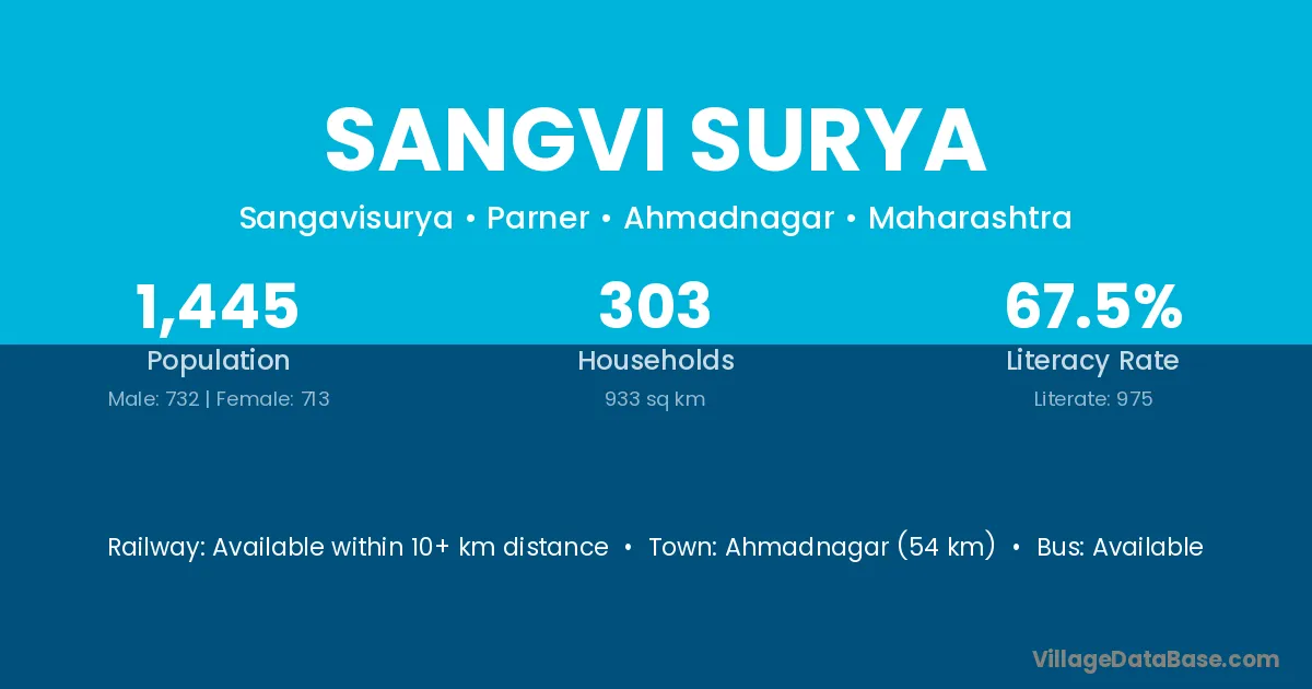 Ahmadnagar (54 km) is the nearest town to Sangvi Surya village for major economic activities and is located approximately 54 km away.
