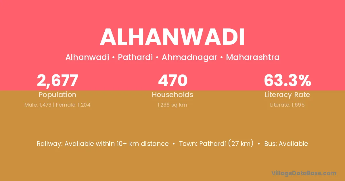 Pathardi (27 km) is the nearest town to Alhanwadi village for major economic activities and is located approximately 27 km away.