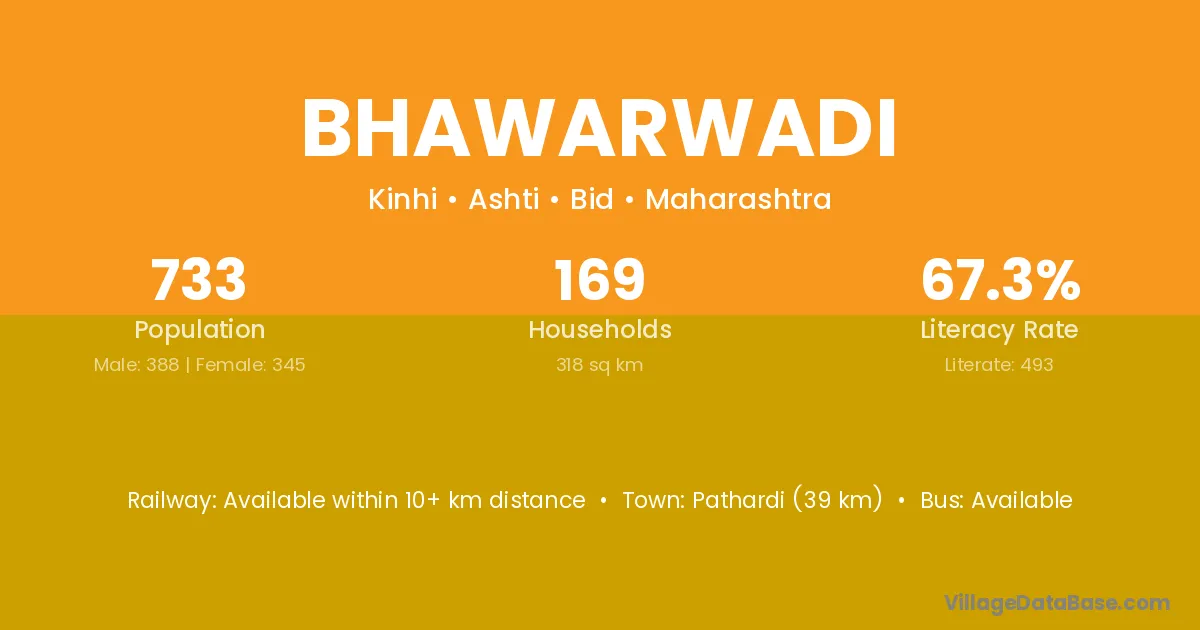 Pathardi (33 km) is the nearest town to Bhawarwadi village for major economic activities and is located approximately 33 km away.