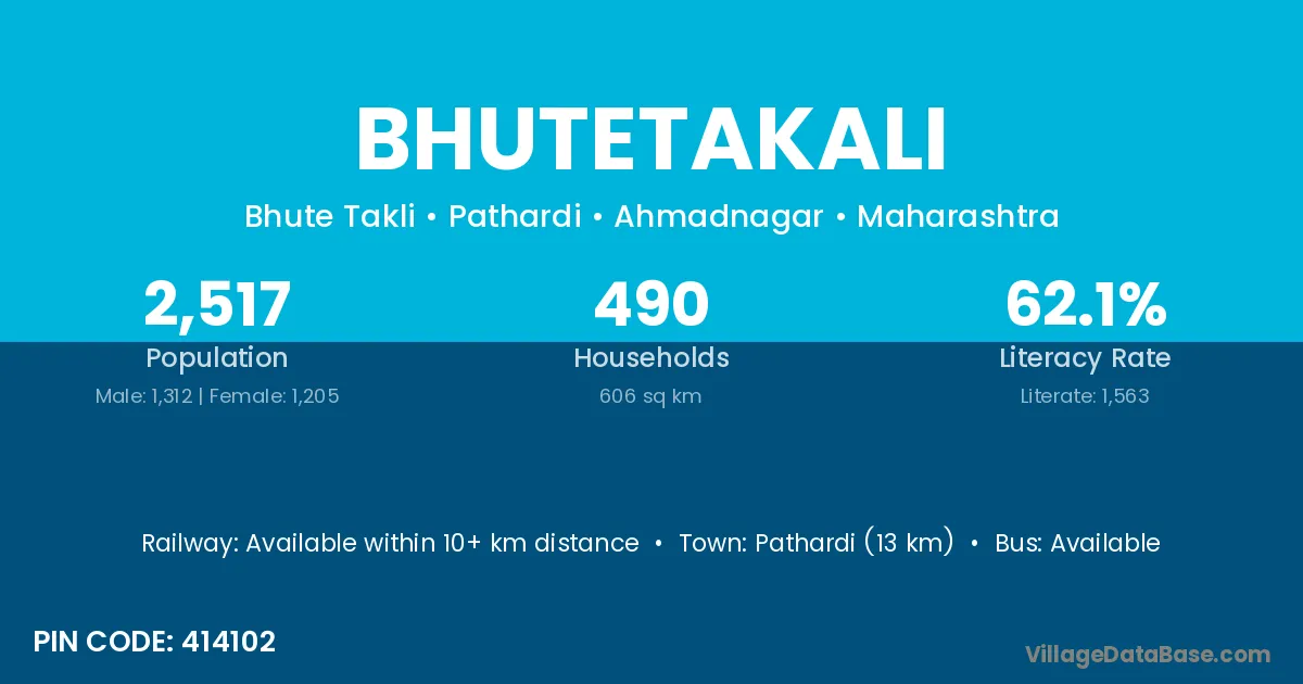 Pathardi (13 km) is the nearest town to Bhutetakali village for major economic activities and is located approximately 13 km away.