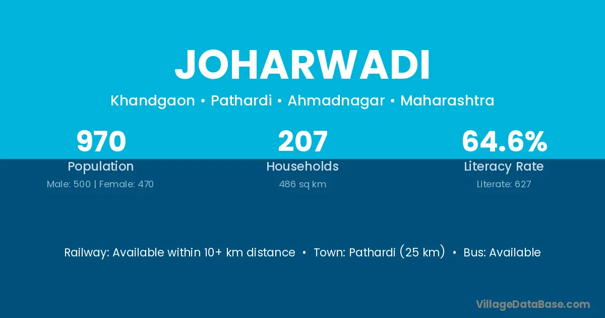 Pathardi (25 km) is the nearest town to Joharwadi village for major economic activities and is located approximately 25 km away.