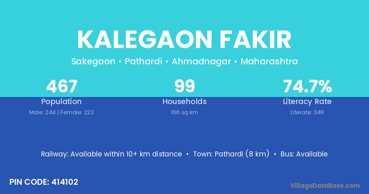 Pathardi (8 km) is the nearest town to Kalegaon Fakir village for major economic activities and is located approximately 8 km away.