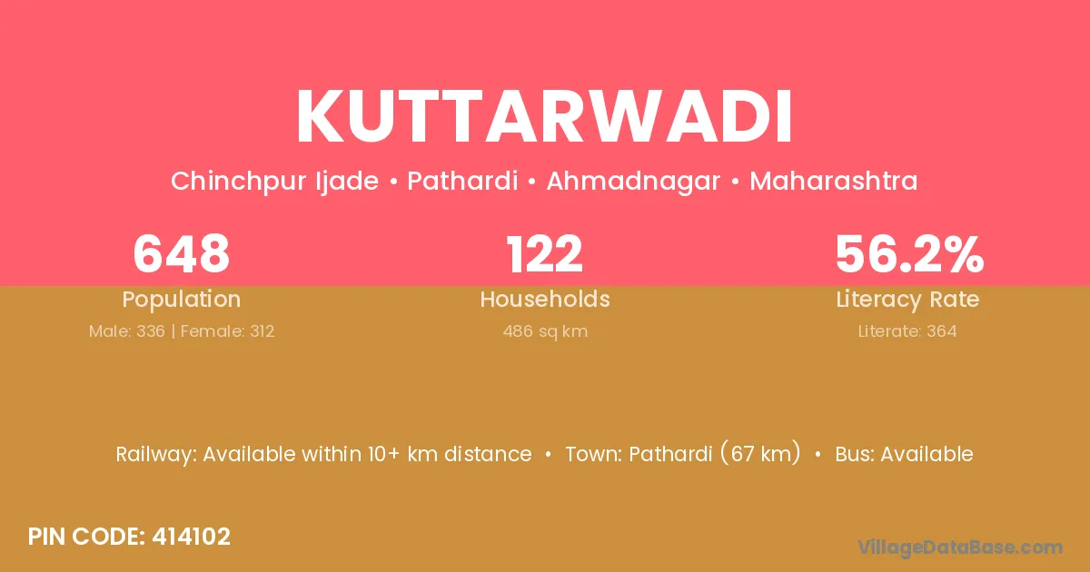 Pathardi (67 km) is the nearest town to Kuttarwadi village for major economic activities and is located approximately 67 km away.