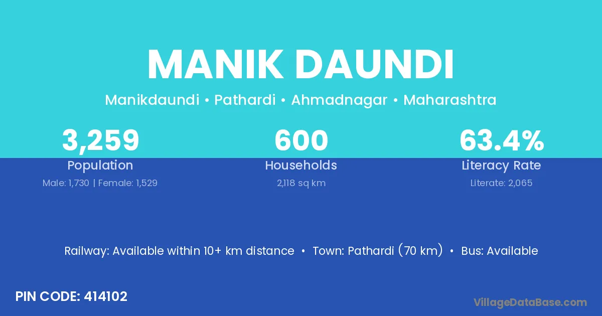 Pathardi (70 km) is the nearest town to Manik Daundi village for major economic activities and is located approximately 70 km away.