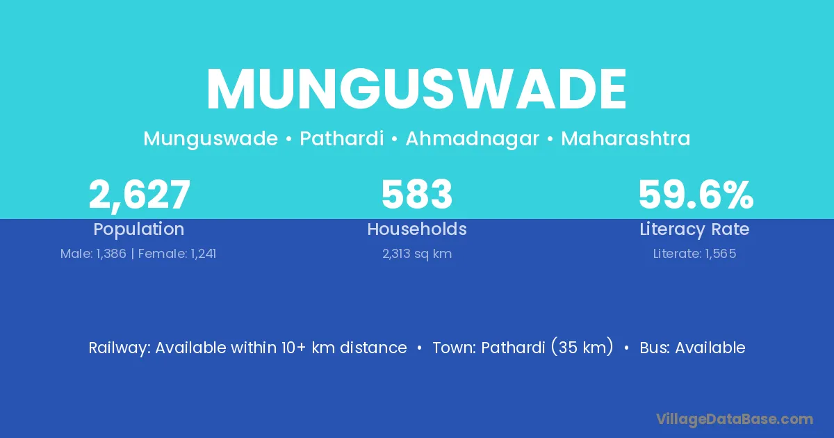 Pathardi (35 km) is the nearest town to Munguswade village for major economic activities and is located approximately 35 km away.