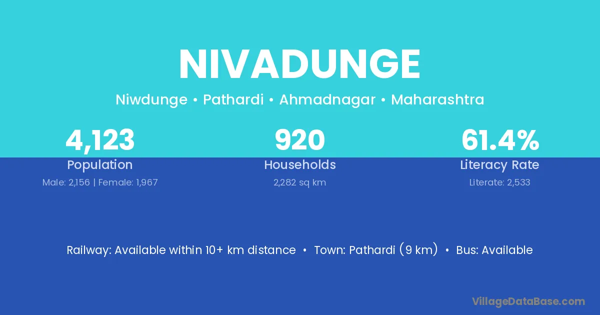 Pathardi (9 km) is the nearest town to Nivadunge village for major economic activities and is located approximately 9 km away.