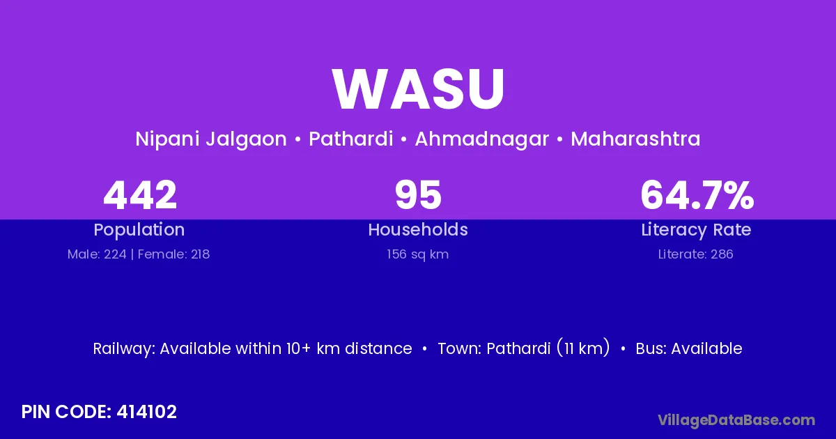 Pathardi (11 km) is the nearest town to Wasu village for major economic activities and is located approximately 11 km away.