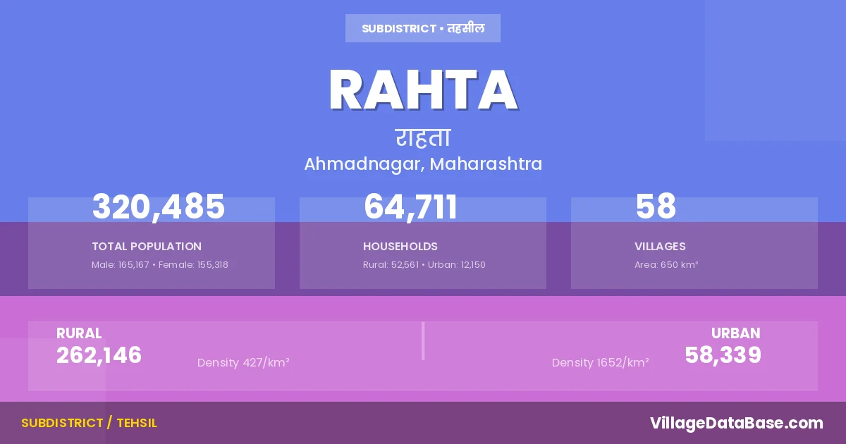 Rahta is a town and Tehsil in the Ahmadnagar district of the Maharashtra. In India, a Tehsil is a subdivision of a district responsible for the administration and revenue collection of a specific area within the district. Tehsils play a crucial role in the local governance structure, contributing significantly to the development and administration of their communities.