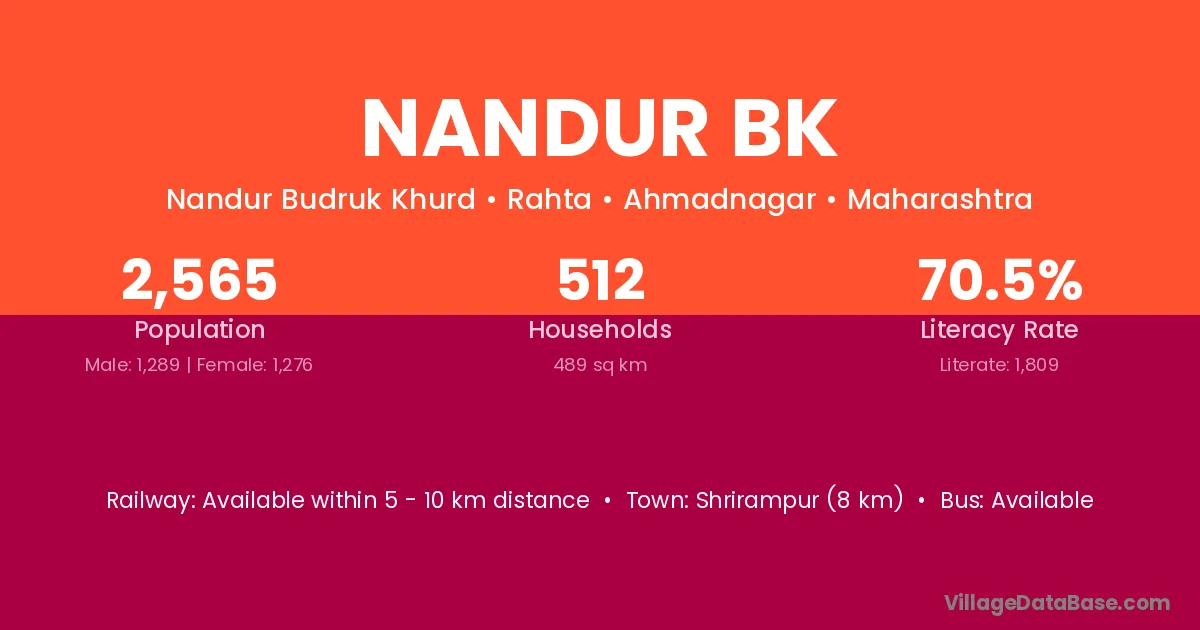 Shrirampur (8 km) is the nearest town to Nandur Bk village for major economic activities and is located approximately 8 km away.