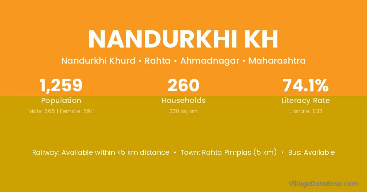 Nandurkhi Kh village has a total population of 1,259 people, of which 665 are males and 594 are females.