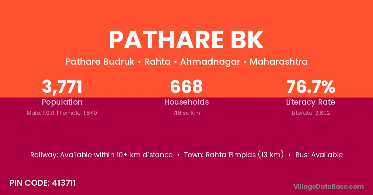 Rahta Pimplas (13 km) is the nearest town to Pathare Bk village for major economic activities and is located approximately 13 km away.