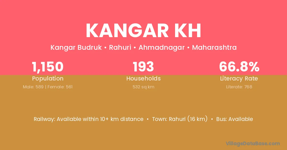 Rahuri (16 km) is the nearest town to Kangar Kh village for major economic activities and is located approximately 16 km away.