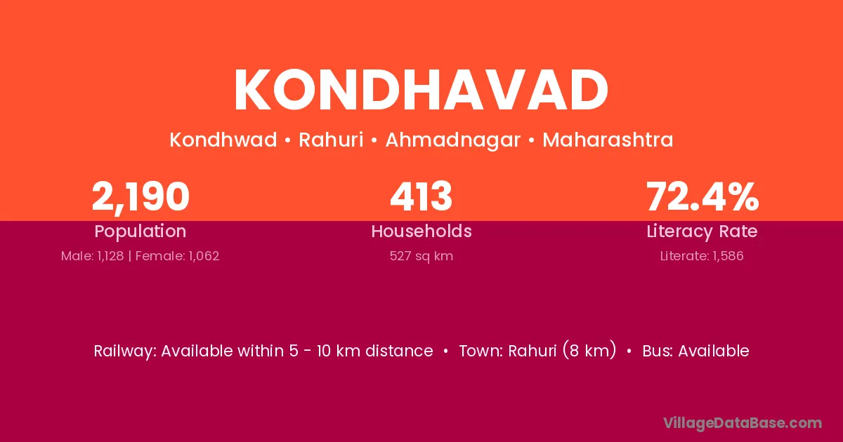 Rahuri (8 km) is the nearest town to Kondhavad village for major economic activities and is located approximately 8 km away.