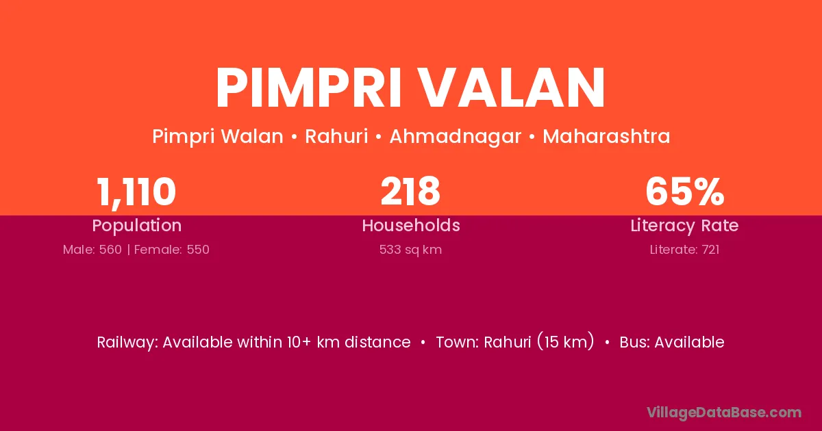 Rahuri (15 km) is the nearest town to Pimpri Valan village for major economic activities and is located approximately 15 km away.