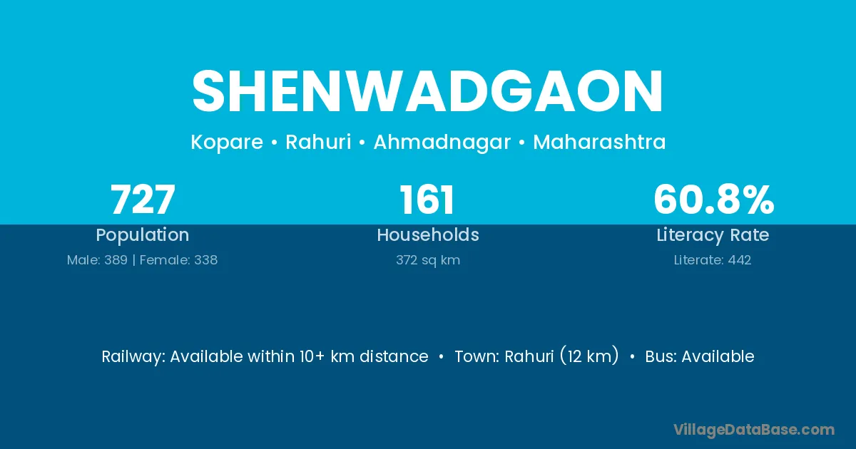 Rahuri (12 km) is the nearest town to Shenwadgaon village for major economic activities and is located approximately 12 km away.