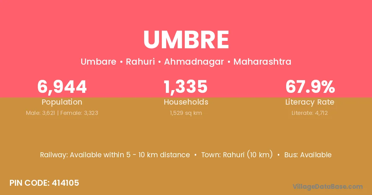 Rahuri (10 km) is the nearest town to Umbre village for major economic activities and is located approximately 10 km away.