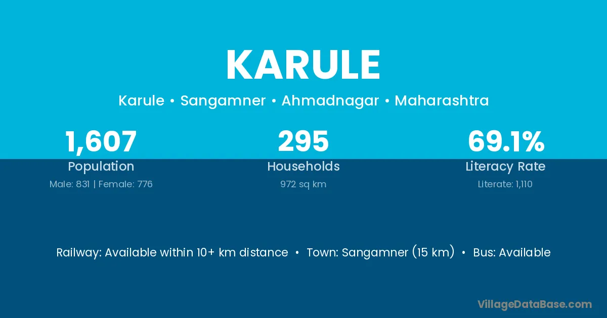Sangamner (15 km) is the nearest town to Karule village for major economic activities and is located approximately 15 km away.
