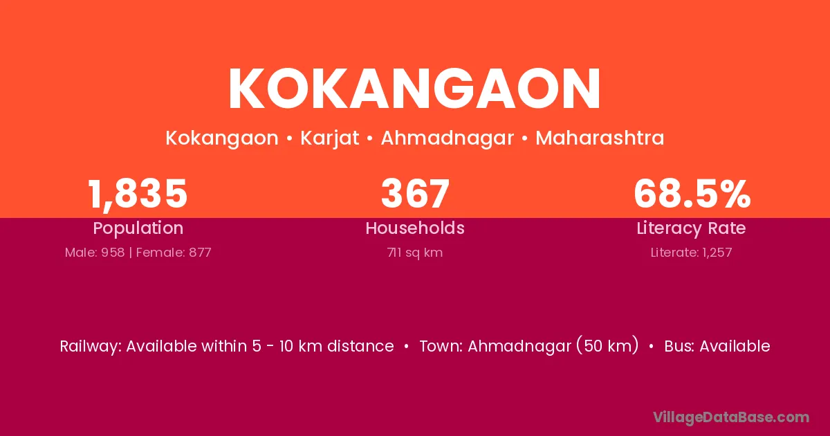 Sangamner (14 km) is the nearest town to Kokangaon village for major economic activities and is located approximately 14 km away.