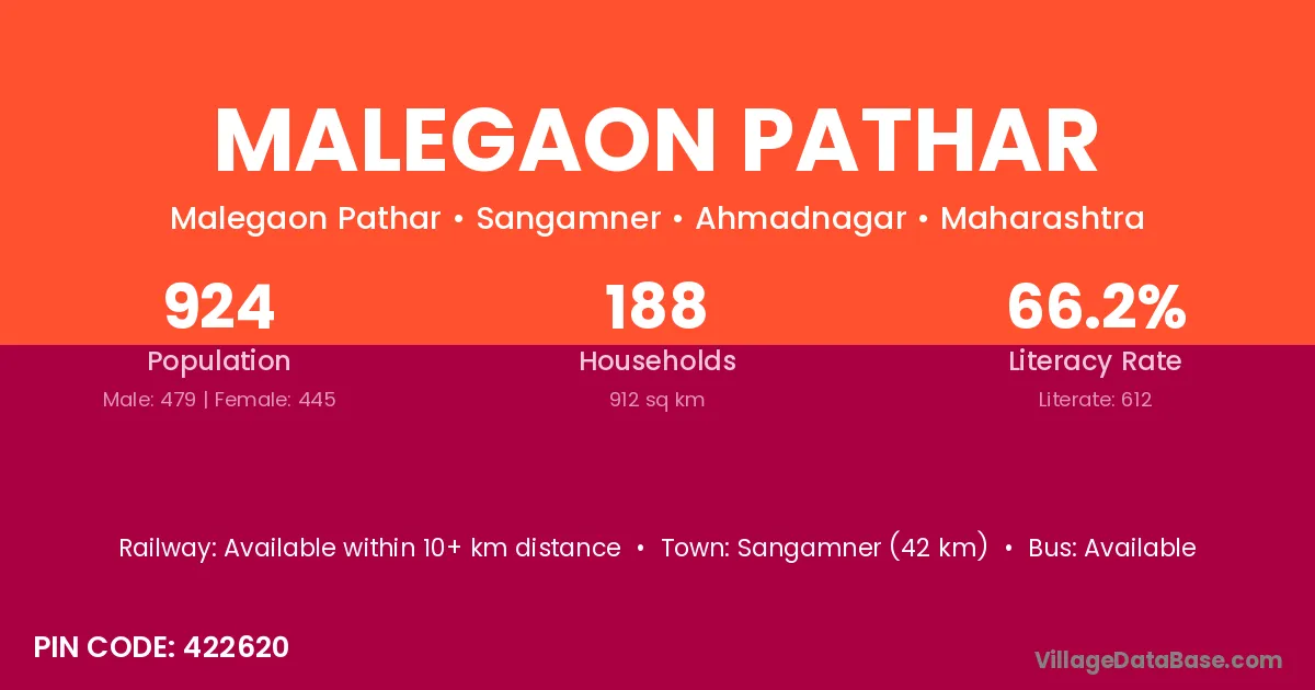 Sangamner (42 km) is the nearest town to Malegaon Pathar village for major economic activities and is located approximately 42 km away.