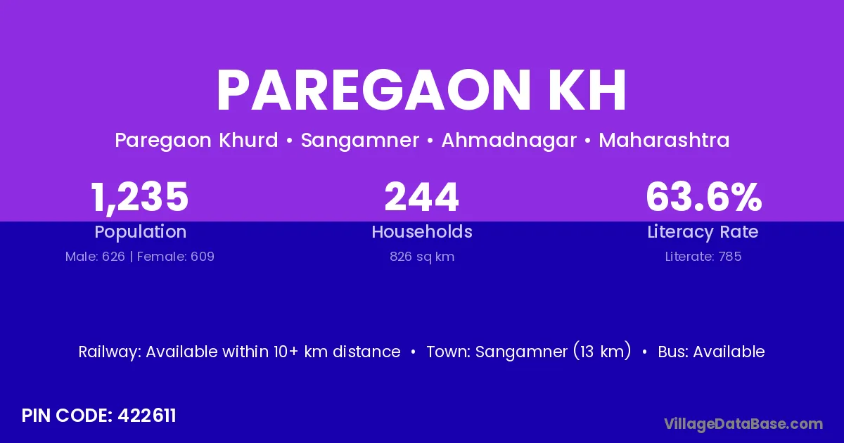 Paregaon Kh village has a total population of 1,235 people, of which 626 are males and 609 are females.
