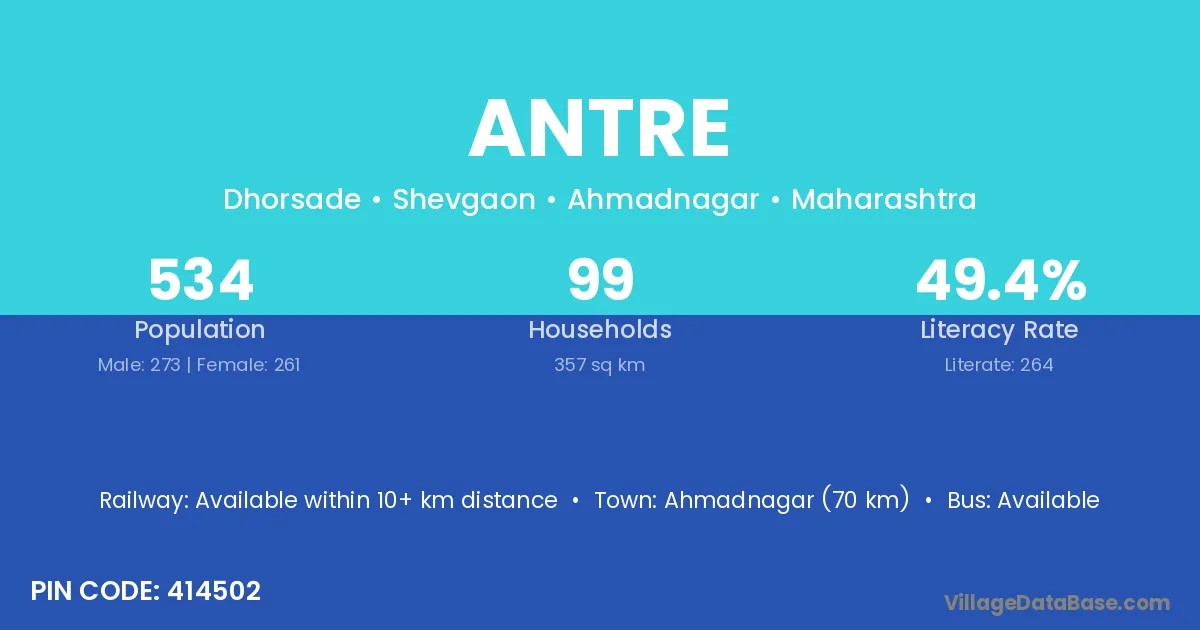 Ahmadnagar (70 km) is the nearest town to Antre village for major economic activities and is located approximately 70 km away.