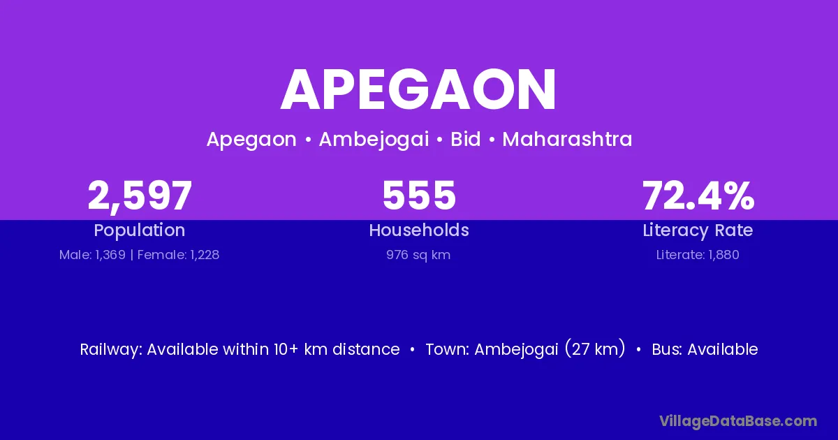 Ahmadnagar (57 km) is the nearest town to Apegaon village for major economic activities and is located approximately 57 km away.