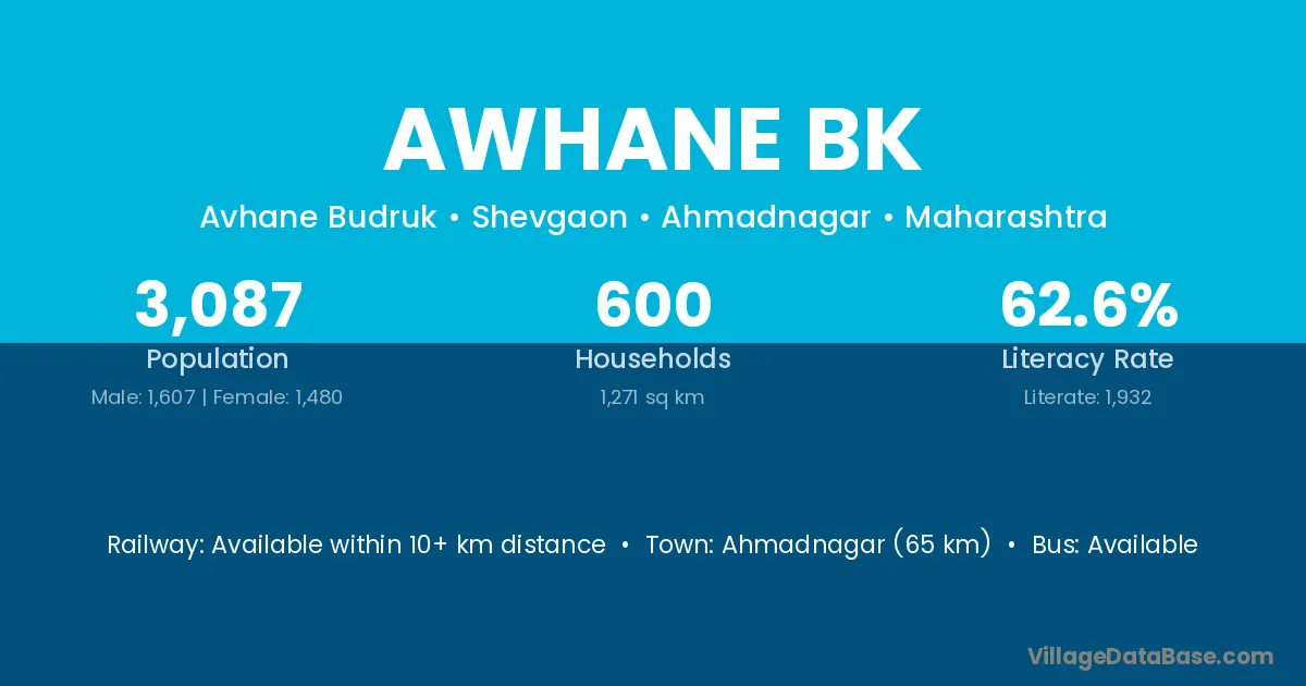 Ahmadnagar (65 km) is the nearest town to Awhane Bk village for major economic activities and is located approximately 65 km away.