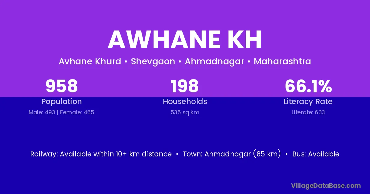 Awhane Kh village has a total population of 958 people, of which 493 are males and 465 are females.