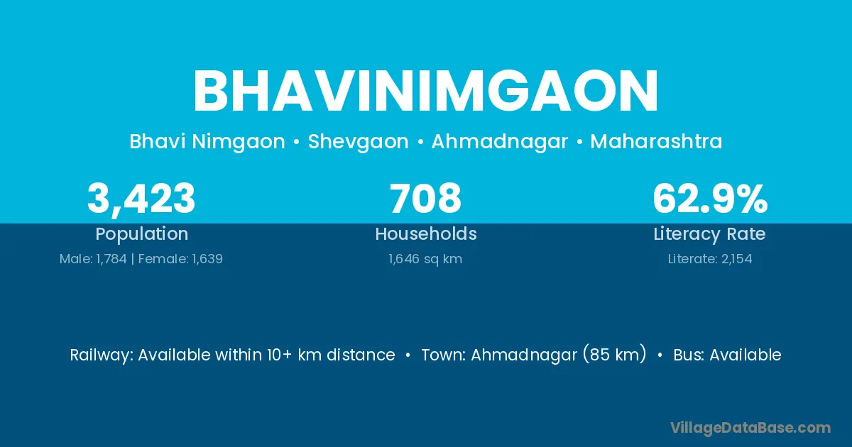 Ahmadnagar (85 km) is the nearest town to Bhavinimgaon village for major economic activities and is located approximately 85 km away.