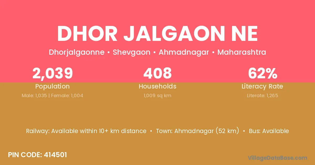 Dhor Jalgaon Ne village has a total population of 2,039 people, of which 1,035 are males and 1,004 are females.